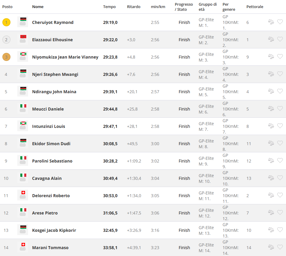 È stata una gara vibrante, decisa soltanto negli ultimi metri, quella che ha visto imporsi Cheruiyot Raymond con il tempo di 29’19”. Il keniano ha avuto la meglio al termine di uno sprint lunghissimo e serrato che ha coinvolto ben quattro atleti racchiusi in appena sette secondi.
