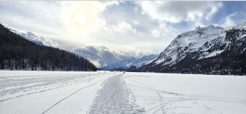 La partenza da Silvaplana avviene nel silenzio nitido del mattino invernale, quando l’aria è così tersa da sembrare fragile, come vetro sottile. Il lago ghiacciato si distende davanti a te in una vastità luminosa, una pianura candida che riflette il cielo in mille sfumature di bianco e d’argento…
