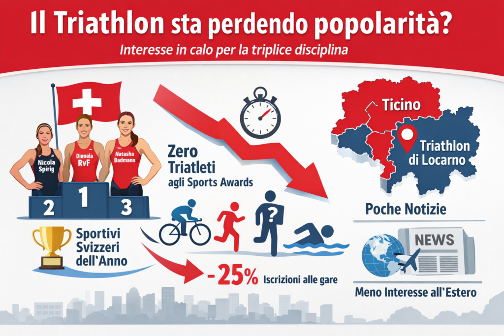 Il triathlon, dopo anni di successi in Svizzera con campioni come Spirig e Ryf, sembra oggi aver perso centralità mediatica. L’assenza di triatleti agli ultimi Sports Awards e la minore copertura stampa segnalano un calo di visibilità. Anche i dati indicano difficoltà, soprattutto nelle gare lunghe, frenate da costi elevati e impegno richiesto. In Ticino solo il Triathlon di Locarno mantiene viva l’attenzione. Più che un declino sportivo, emerge una crisi di attrattiva e narrazione nel panorama contemporaneo.