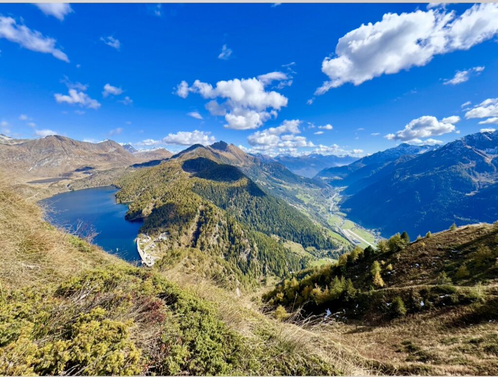 Raggiunta la vetta del Föisc, segnata da una croce di legno, si resta senza parole. Davanti agli occhi si apre un panorama vastissimo: il massiccio del San Gottardo, la Valle Bedretto, i laghi di Ritom e Cadagno che luccicano come frammenti di specchio, e più lontano le catene innevate delle Alpi bernesi.